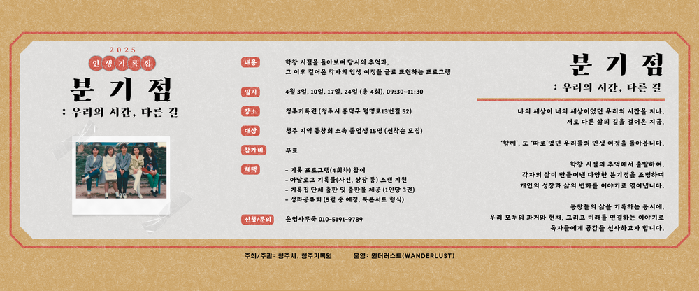 학창 시절을 돌아보며 당시의 추억과, 그 이후 걸어온 각자의 인생 여정을 글로 표현한다